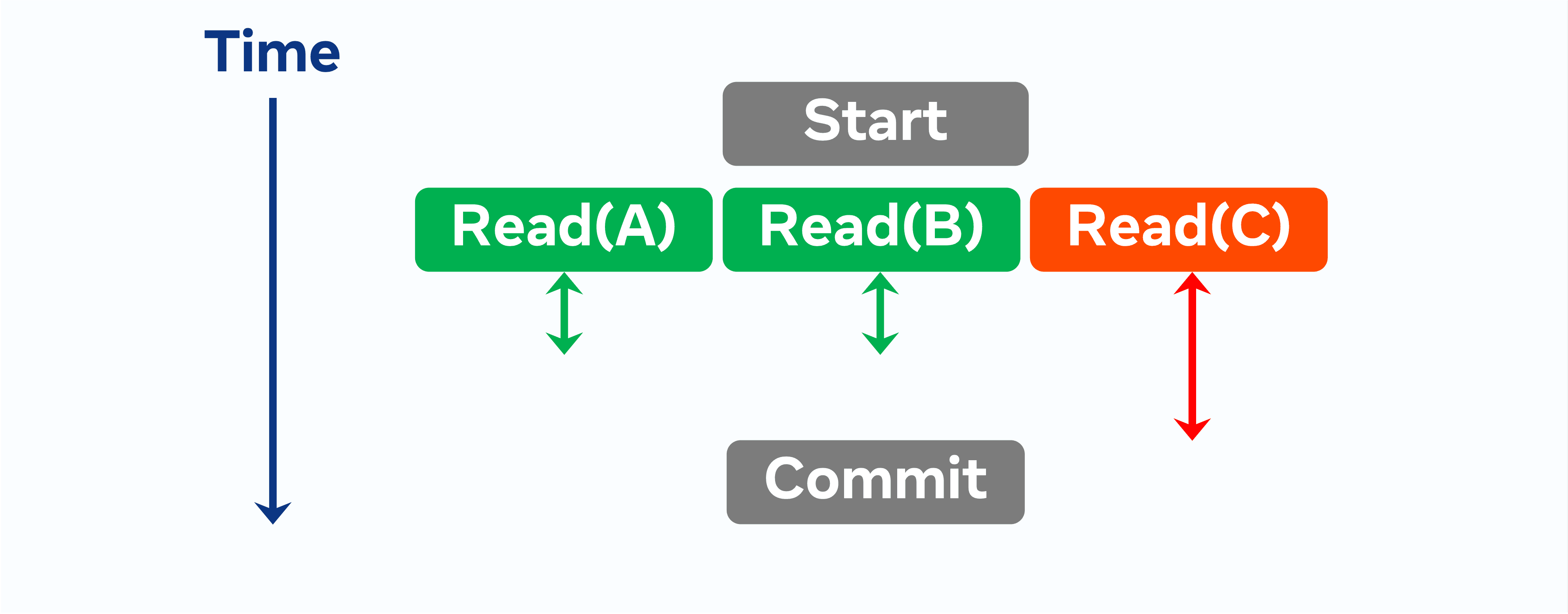 Consider for example a simple transaction that reads A, B, and C in parallel. If A and B are in cache but C is not, we get no latency improvement because we still need to wait for C to be fetched from disk. Only when A, B, and C are all cached do we see a latency reduction for the transaction. In this case, “hot” (frequently accessed) keys A and B are requested in parallel alongside a “cold” (rarely accessed) key C. In effect, cold keys can “contaminate” (degrade the cacheability of) hot keys.