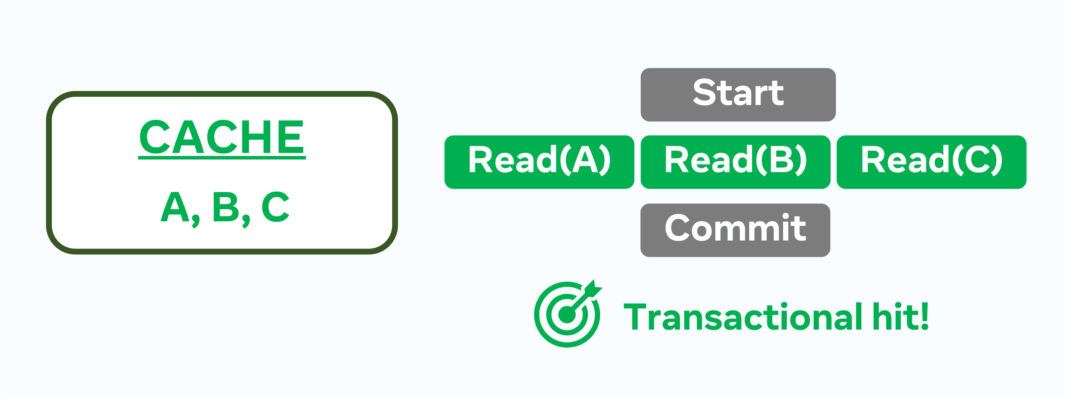 Intuitively, transactional hit rate represents how often the groups of keys accessed in parallel by transactions are available in cache. This metric captures performance improvements when caching for transactions, much like how its single-object counterpart, object hit rate, does so for individual requests. A formal definition can be found in our OSDI paper.