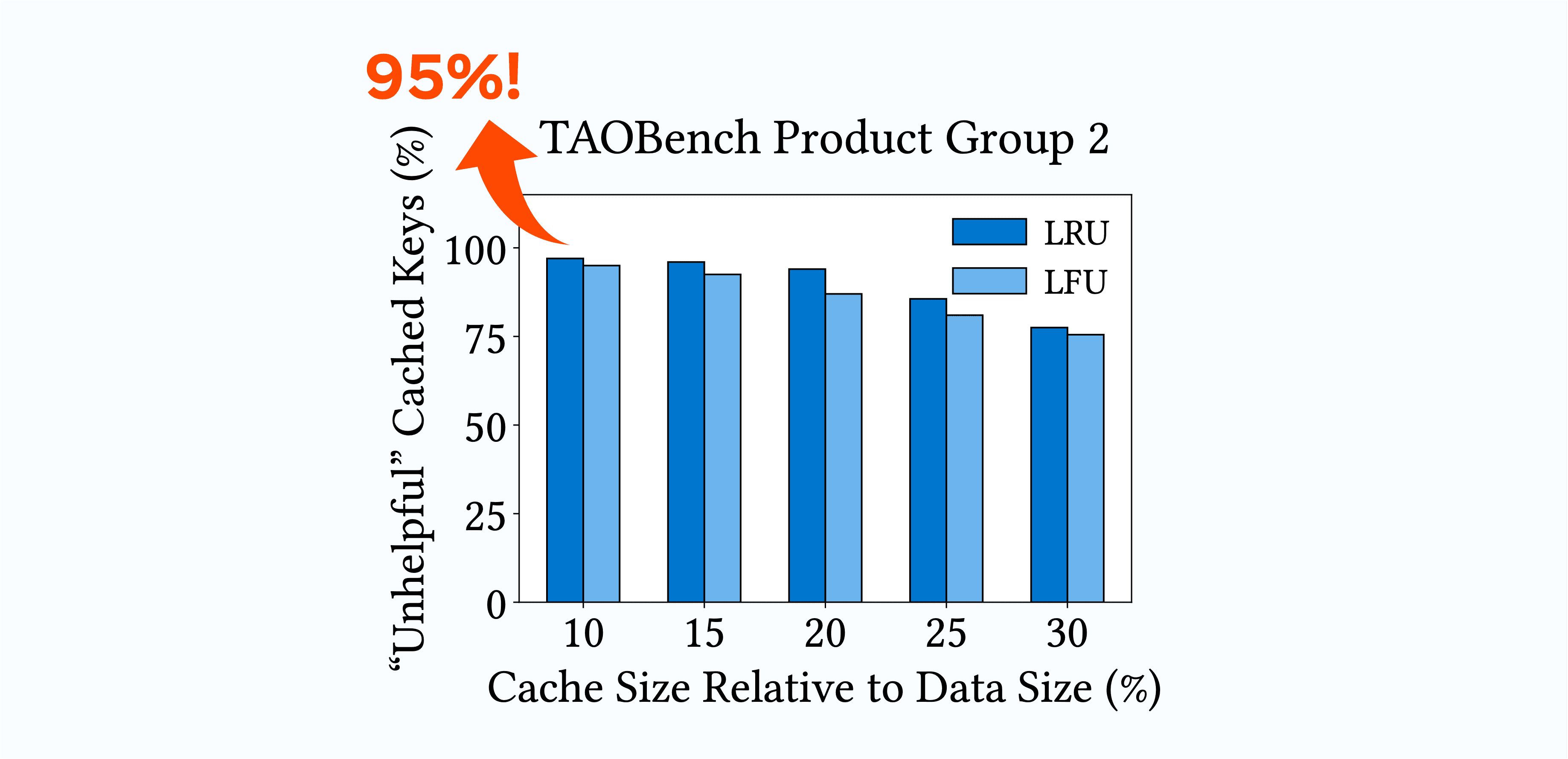 To see this, we evaluate the performance of two popular caching algorithms, least recently used (LRU) and least frequently used (LFU), on a Meta production workload from TAOBench. Specifically, we measure the fraction of cached keys that do not improve overall transaction latency (``unhelpful’’ cached keys). As the figure below shows, up to 95% of cached keys do not help performance.